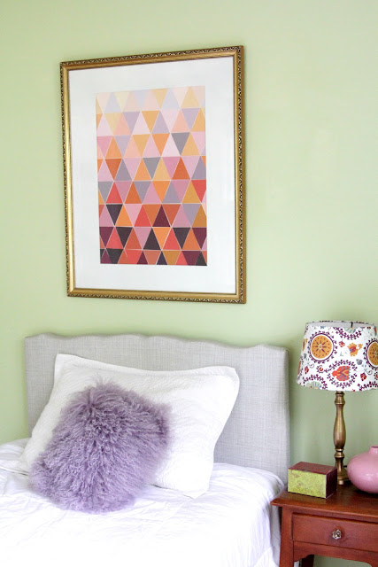 I had two gold lamps that I found at a flea mart for $5 each a while back. This summer, I found the shades at World Market and loved the color combo. The room was already green, so I decided to accent with gold, corals, pinks, and purples.