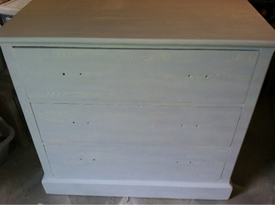 After priming and painting the dresser in white diamond by Benjamin Moore I got to work faxing the face of the dresser with white satin which reads as a light blue